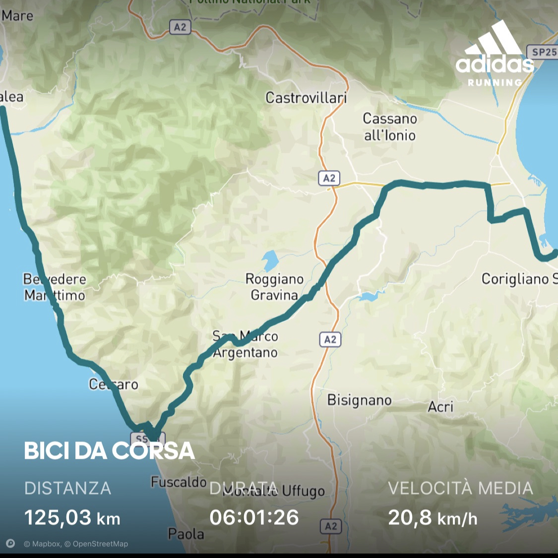 Dopo le lunghe salite sulla statale e un paio di km di sterrato, dovuti a una delle mie scorciatoie, a Guardia Piemontese, attacco la salita per spostarmi sul versante ionico. La pendenza è tutt’altro che proibitiva, tuttavia la lunga strada, mette comunque alla prova. Saranno stati 18 chilometri di salita panoramica, poi si scollina. Dopo una lunga discesa, arrivato sul litorale, la pioggia rinfresca l’arrivo a Corigliano Calabro. Trovo posto nel primo hotel sul lungo mare. I dati x i tecnici: 125km percorsi D+1758mt